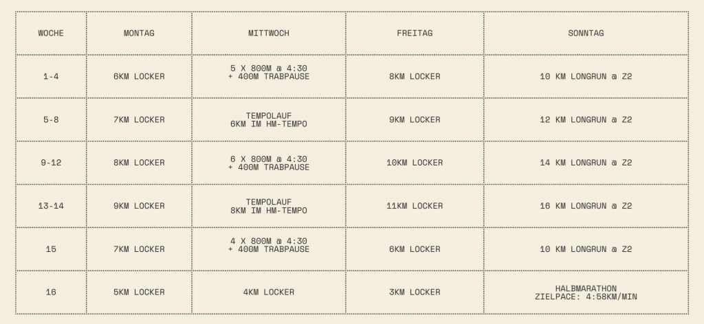 Der Trainingsplan für den Halbmarathon fokussiert sich auf eine ausgewogene Mischung aus leichten Läufen, Intervalltraining, Tempoläufen und langen Läufen, um sowohl Ausdauer als auch Geschwindigkeit zu verbessern. Er ist ideal für Läufer, die viermal pro Woche trainieren können und eine Zielzeit von 2:15 Stunden anstreben. Die wichtigsten Aspekte sind die schrittweise Steigerung der Laufdistanzen und -intensitäten sowie die Erholung zwischen den Trainingseinheiten, um Verletzungen zu vermeiden und die Leistungsfähigkeit zu maximieren.