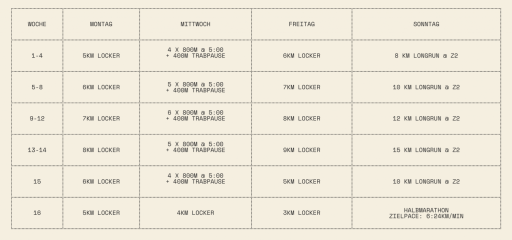 Der Trainingsplan für den Halbmarathon fokussiert sich auf eine ausgewogene Mischung aus leichten Läufen, Intervalltraining, Tempoläufen und langen Läufen, um sowohl Ausdauer als auch Geschwindigkeit zu verbessern. Er ist ideal für Läufer, die viermal pro Woche trainieren können und eine Zielzeit von 2:15 Stunden anstreben. Die wichtigsten Aspekte sind die schrittweise Steigerung der Laufdistanzen und -intensitäten sowie die Erholung zwischen den Trainingseinheiten, um Verletzungen zu vermeiden und die Leistungsfähigkeit zu maximieren.