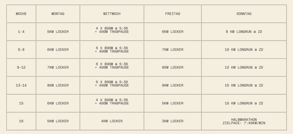 Der Trainingsplan für den Halbmarathon fokussiert sich auf eine ausgewogene Mischung aus leichten Läufen, Intervalltraining, Tempoläufen und langen Läufen, um sowohl Ausdauer als auch Geschwindigkeit zu verbessern. Er ist ideal für Läufer, die viermal pro Woche trainieren können und eine Zielzeit von 2:45 Stunden anstreben. Die wichtigsten Aspekte sind die schrittweise Steigerung der Laufdistanzen und -intensitäten sowie die Erholung zwischen den Trainingseinheiten, um Verletzungen zu vermeiden und die Leistungsfähigkeit zu maximieren.