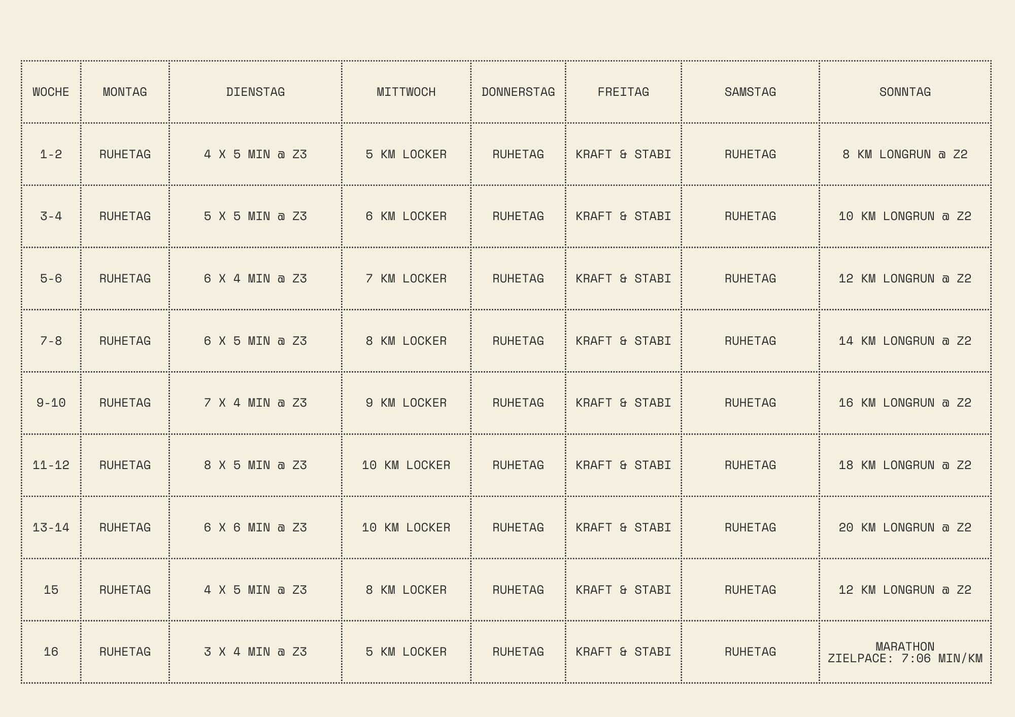 Tapering (Woche 16): In der letzten Woche wird der Umfang stark reduziert, um frisch und erholt an den Start zu gehen. |